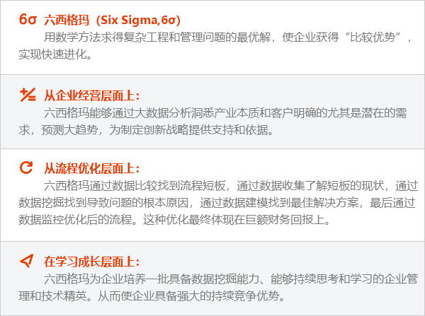 六西格玛源于制造业,目前应用最深入广泛的也是在制造业。制造业特点是流程节点清晰,业务标准化程度高,数据基础好,流程复杂,问题难度等级高,影响变量众多且可控程度高,有形产品的质量提升客观可衡量。这是六西格玛在制造业推广的基础。制造业通过实施六西格玛管理可以迅速解决一批长期困扰企业的重大问题,获取可观的财务节约,培养一批掌握先进理念方法的管理技术骨干。使企业短期内获得“点石成金的能力”。进入大数据时代和智能制造时代,六西格玛的数据挖掘能力是制造业挖掘客户潜在需求、抓住市场机会、在竞争加剧环境下通过管理创新立于不败之地的致胜法宝。